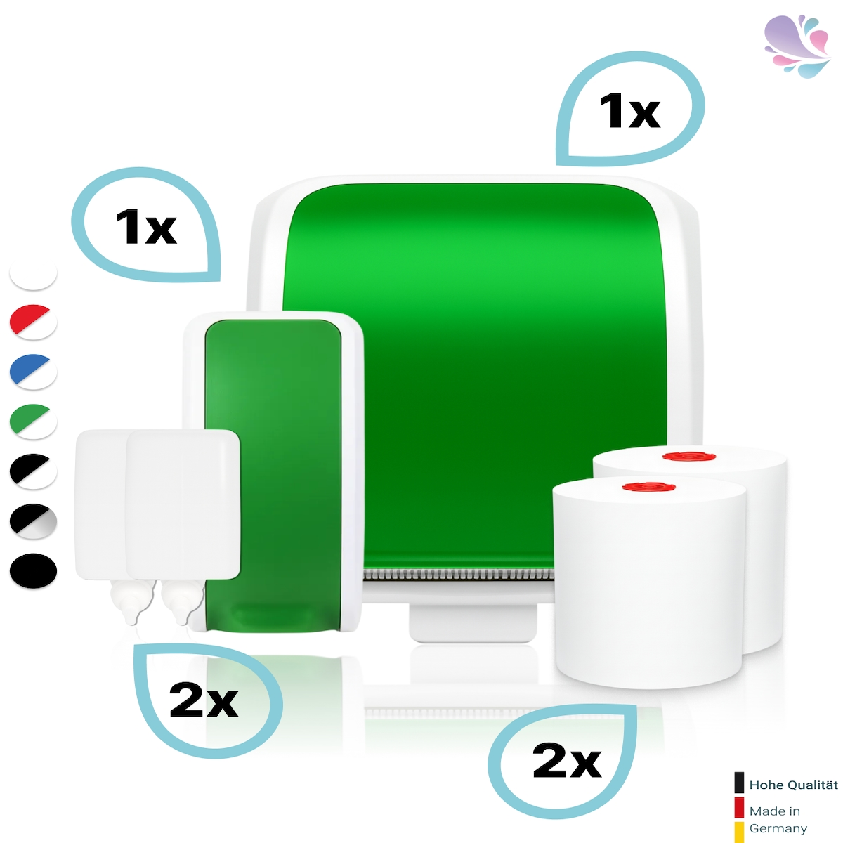 KOMPLETT-SET Waschraum: Handtuchrollenspender AUTOCUT + 2 TAD Handtuchrollen + Schaumseifenspender SENSOR + 2 Kartuschen : Farbe - Grün / Weiß Fa...
