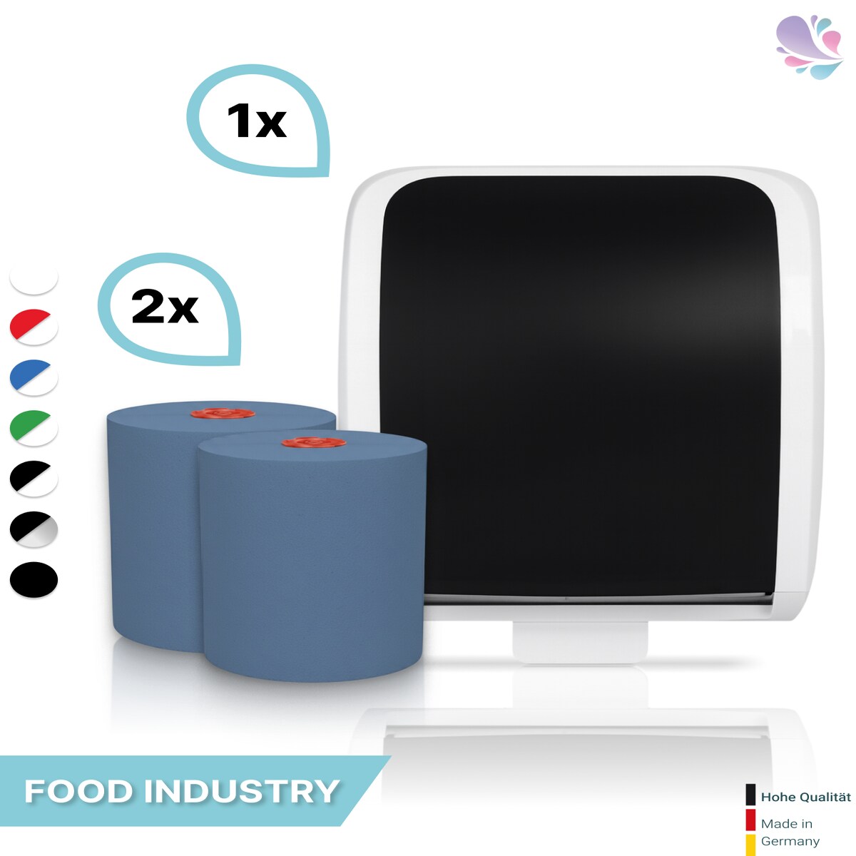 SET: Handtuchrollenspender Autocut, Blanc Cosmos verschied. Farben + 2 Handtuchrollen Classico BLAU - PRODUKTSET : Farbe - Grün / Weiß Farbe: Gr...