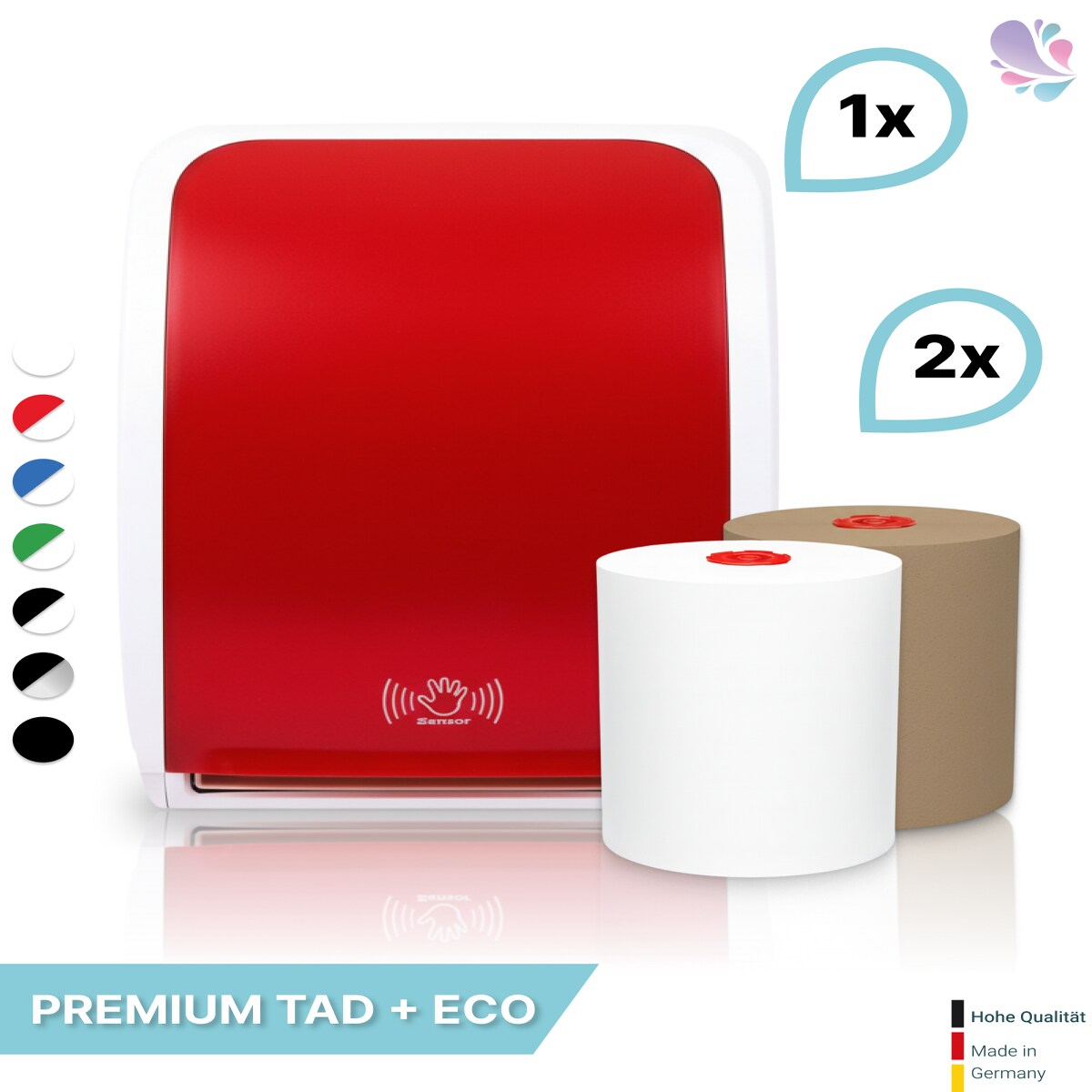 SET: Handtuchrollenspender Autocut, Blanc Cosmos verschied. Farben + 2 Handtuchrollen PREMIUM TAD - PRODUKTSET : Farbe - Rot / Weiß Farbe: Rot / W...