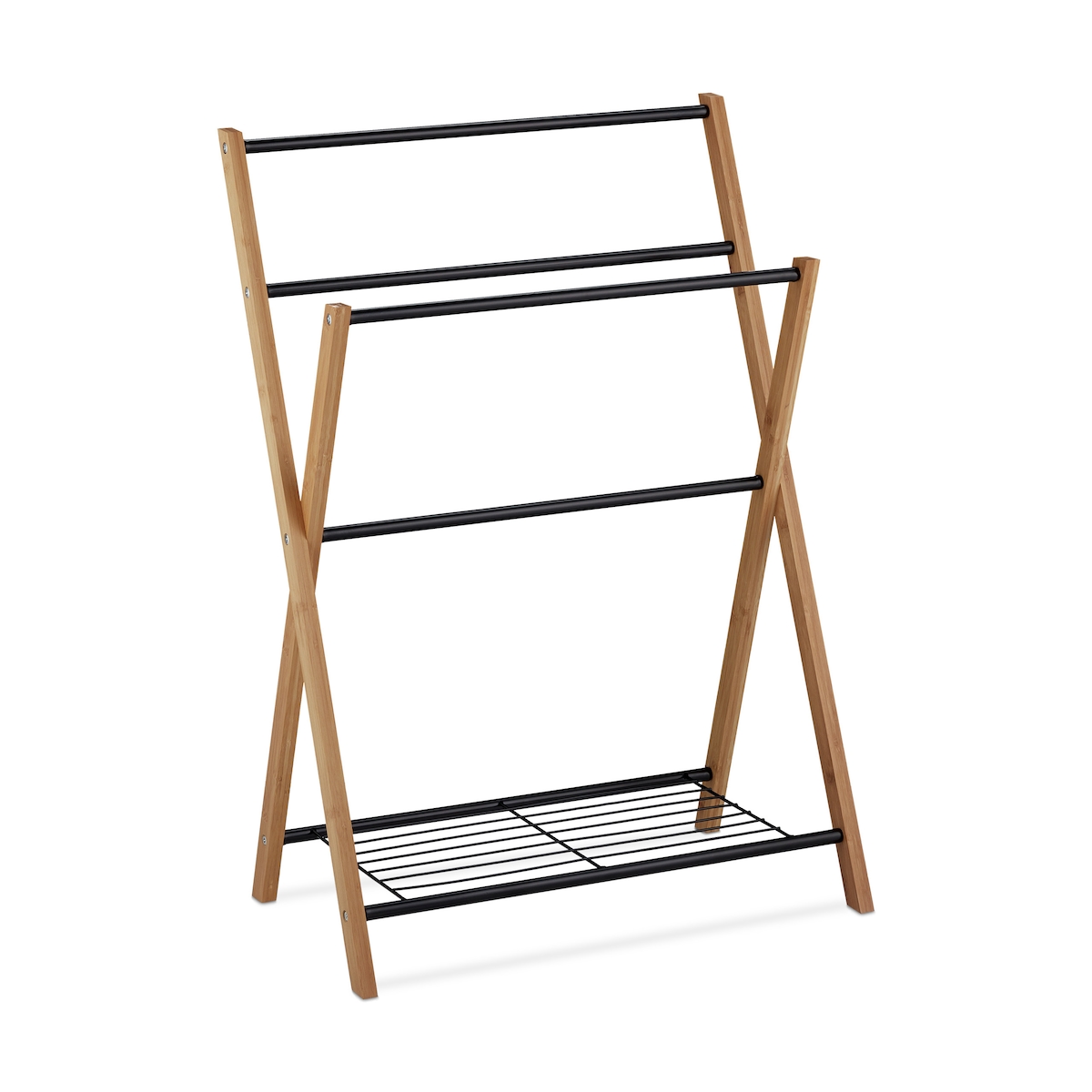 Relaxdays Handtuchhalter stehend, 4 Handtuchstangen, Badablage, Metall, Bambus, HBT 87 x 60,5 x 37,5 cm, schwarz/natur
