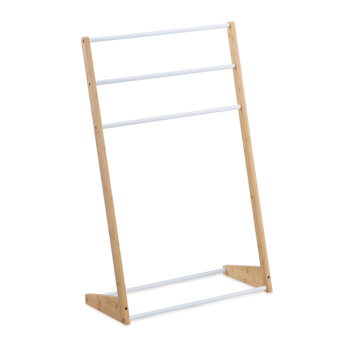 Relaxdays Handtuchhalter stehend, 3 Handtuchstangen, Bad, Schlafzimmer, HBT: 98 x 62 x 30 cm, Bambus & Eisen, natur/weiß