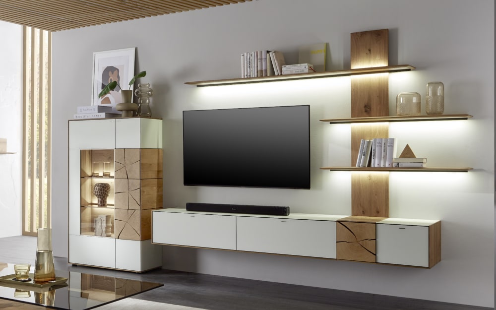 Hartmann Wohnwand Caya, Kerneiche Umato/weiß Glas, Massivholz