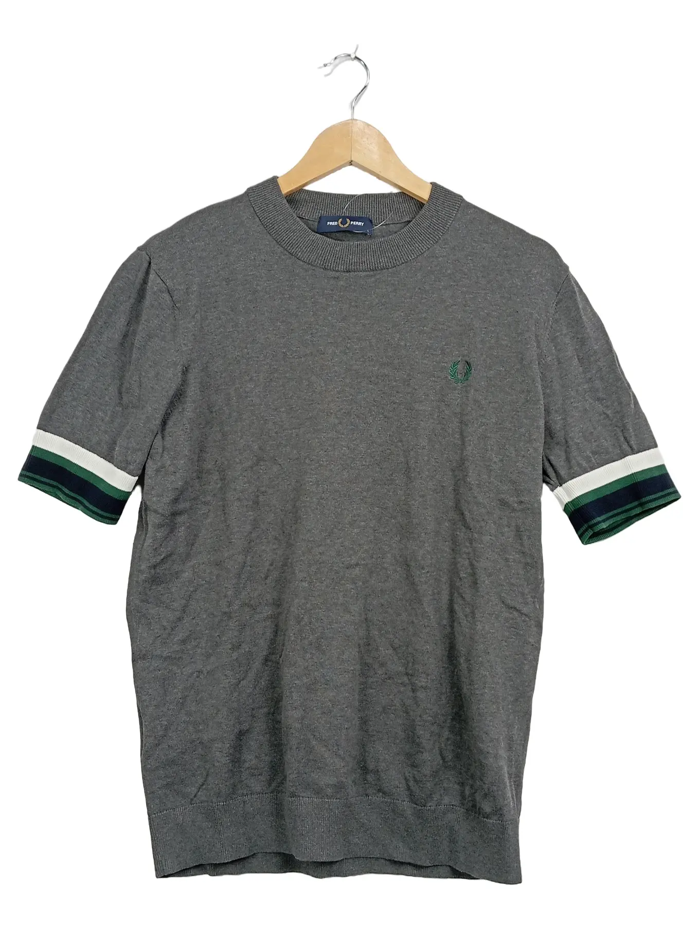 FRED PERRY Herren Strick T-Shirt Grau Gr. L Kurzarm Gestreift Cuff