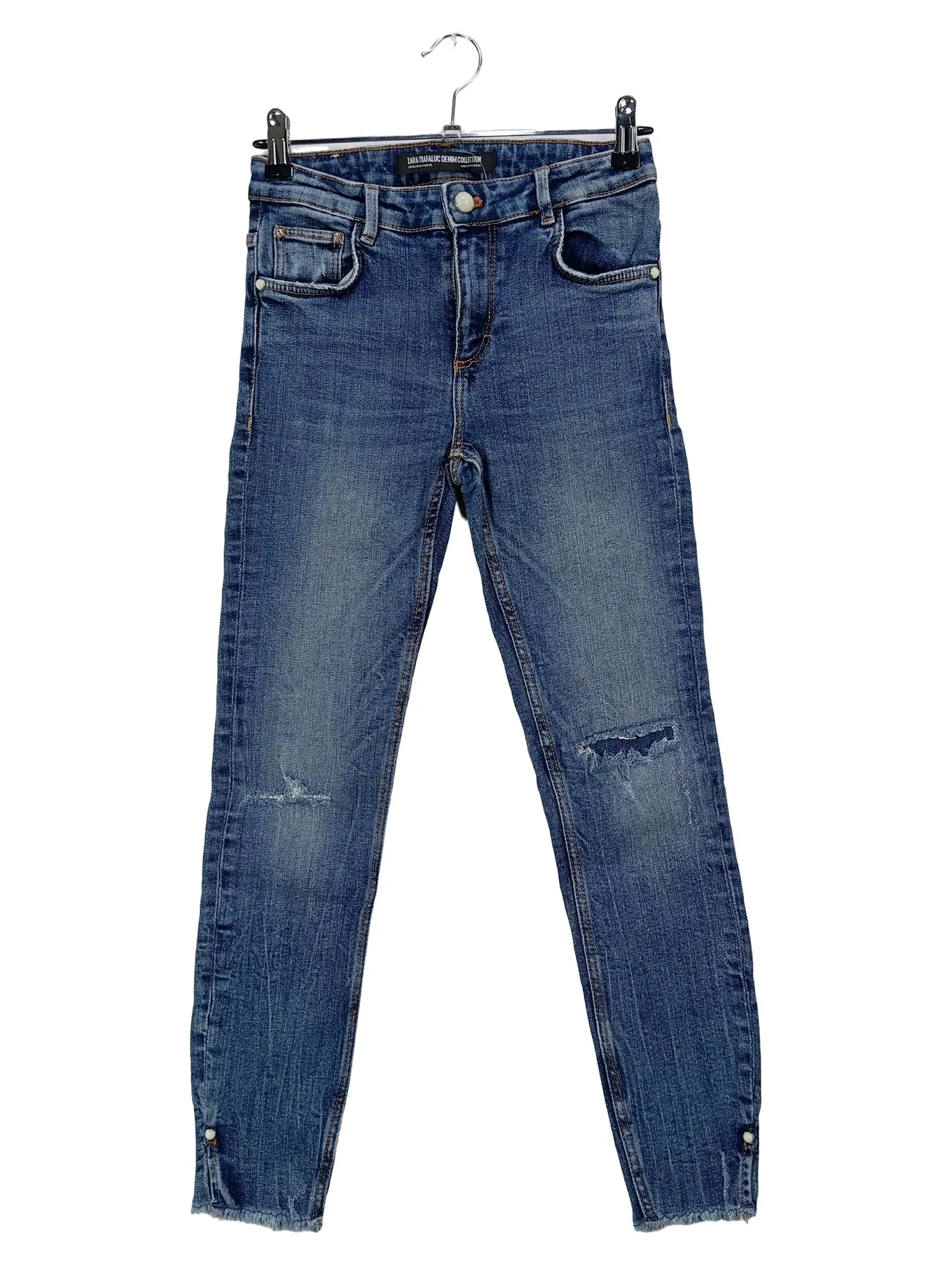 ZARA Damen Jeans Slim Fit Blau Gr. 36 W28 Lochmuster Perlen High Waist