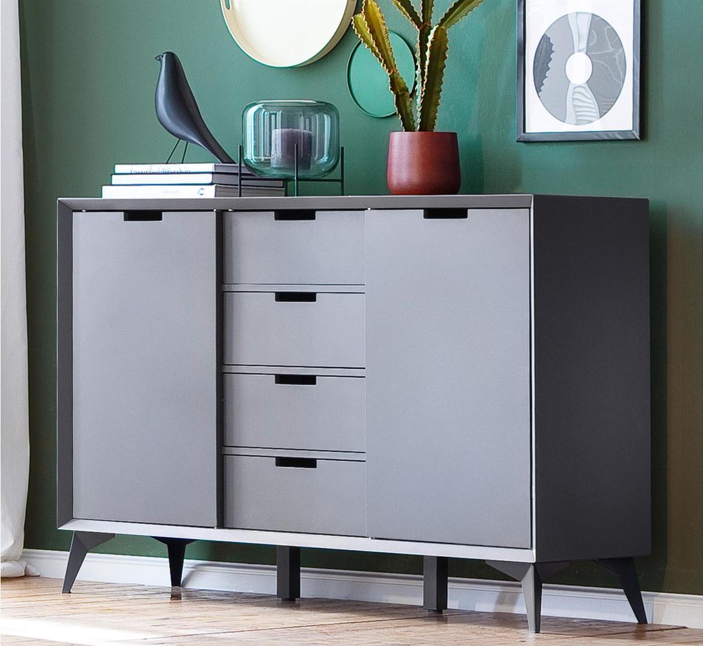 Sideboard, Highboard, 200x35x75cm, 4 Türen, Wohnzimmer, Küche, Zementgrau und Schwarz