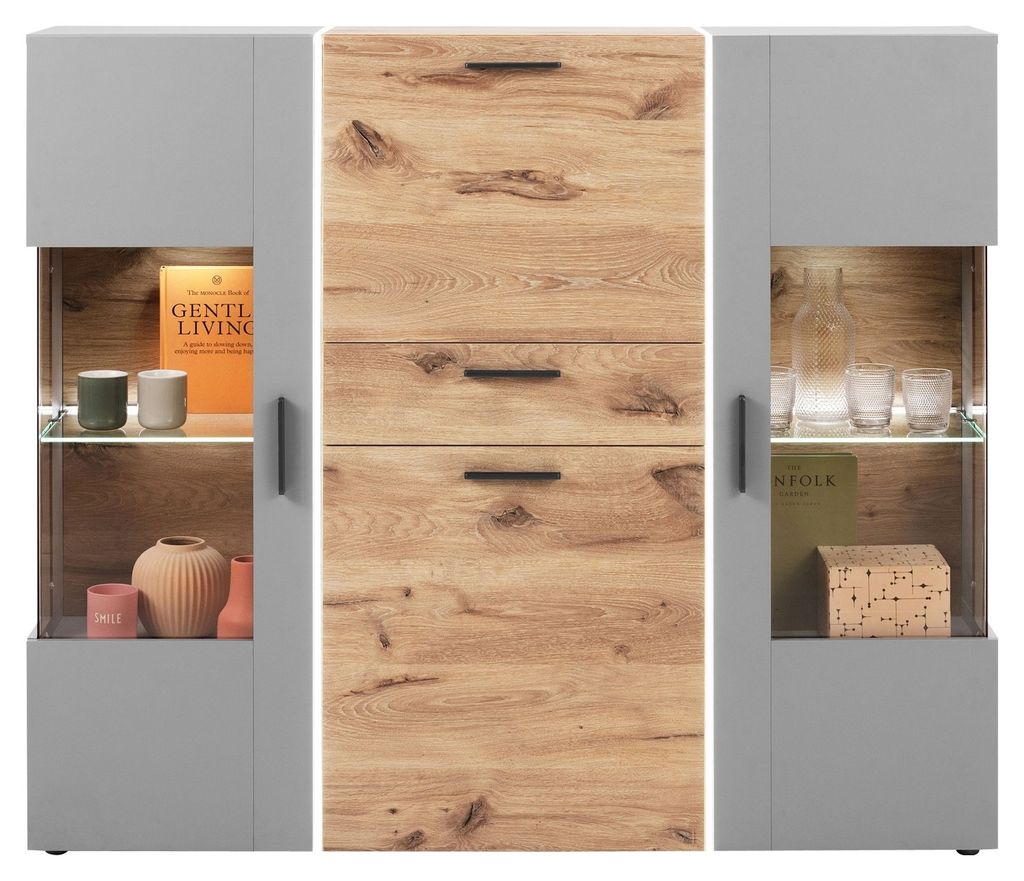 Highboard - 152 x 150 cm - 3 Türen - 1 Schublade - Hellgrau - Nox Eiche Nachbildung - mit LED-Frontbeleuchtung