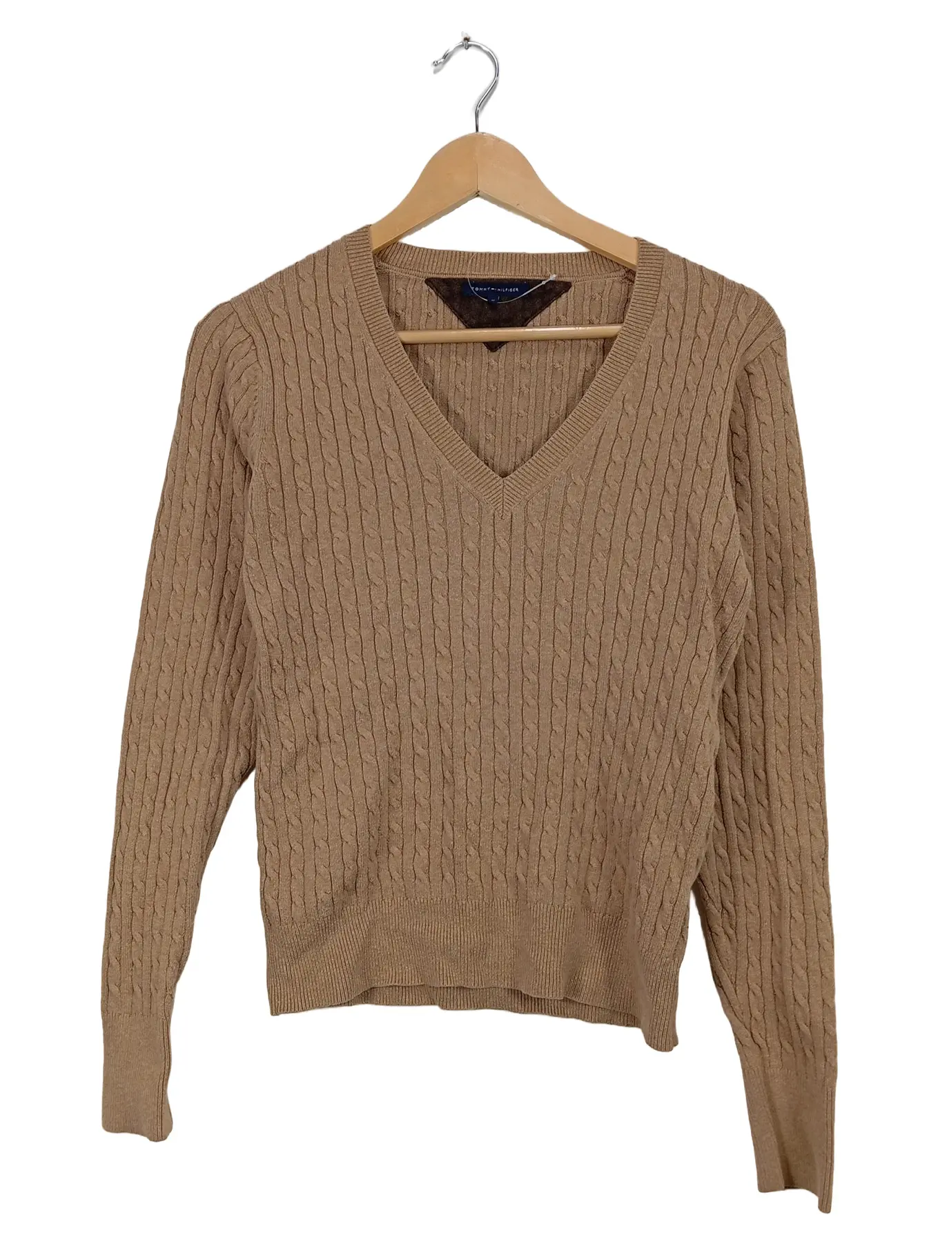 TOMMY HILFIGER Damen Pullover V-Ausschnitt Zopfmuster Beige Gr. M