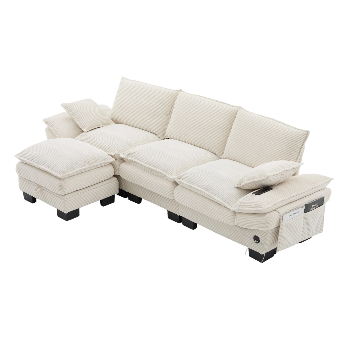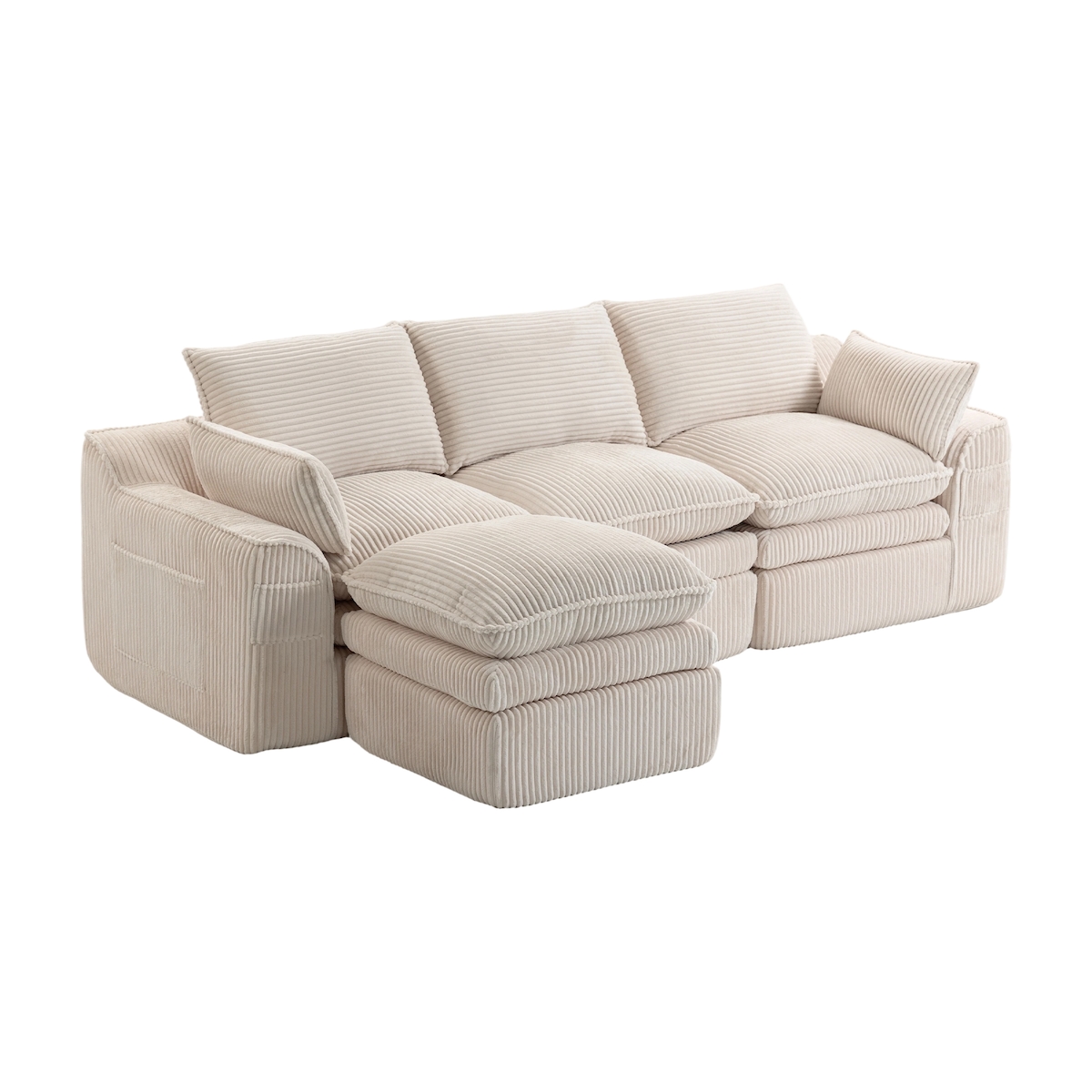 MODFU Gerades 4-Sitzer Corduroy Sofa,Freizeitsofa mit Stauraum unter den Sitzflächen,Wohnzimmersofa inklusive eines frei platzierbaren Hockers,Beige