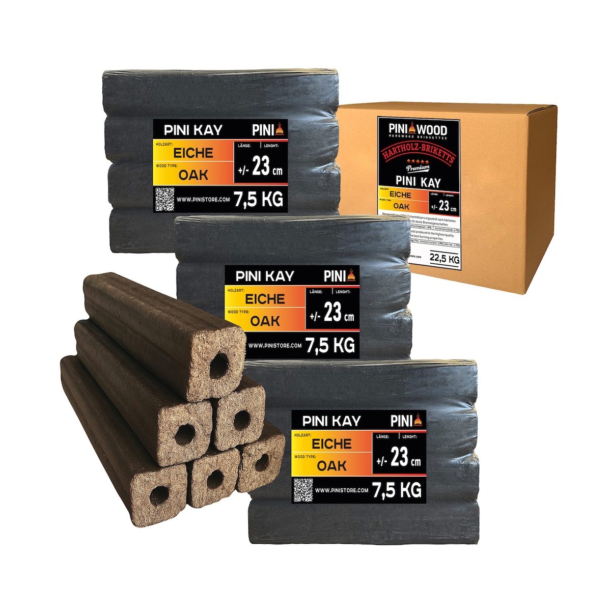 PINI Kay Eichenholzbriketts 23 cm lang viereckig mit Zugloch 22,5 kg Hartholzbriketts Brennholz Holzbriketts Eiche Kamin Ofen Feuerstelle Grill