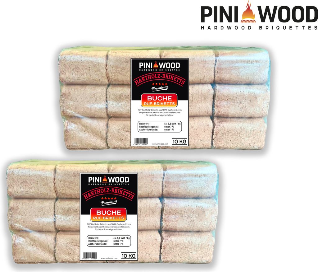 PINI 20 kg Holzbriketts 100% Buche Hartholzbriketts RUF Kamin Ofen Grill Feuerstelle Brennholz, 24 Briketts