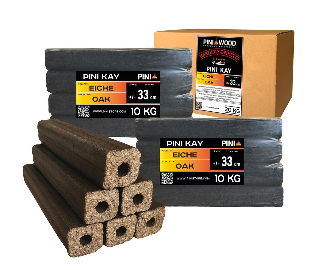 PINI Kay Eichenholzbriketts 33 cm lang viereckig mit Zugloch 20 kg Hartholzbriketts Brennholz Holzbriketts Eiche Kamin Ofen Feuerschale Grill
