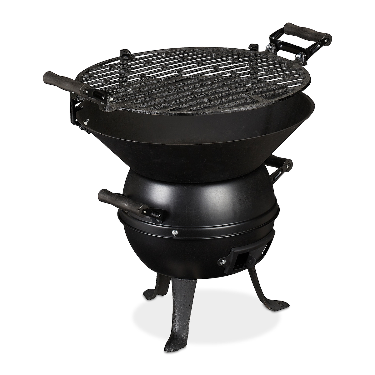 Relaxdays Grillfass, Gusseisen und Stahl, höhenverstellbar, tragbar, Barbecue Holzkohlegrill, Grillrost Ø 35 cm, schwarz