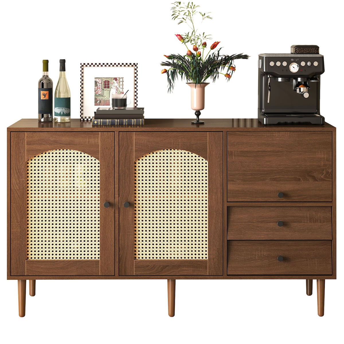 OKWISH Sideboard Landhausstil 130x40x75 cm mit Rattantüren und verstellbaren Regalen, Holzkommode für Wohnzimmer Esszimmer Flur, Holzfarbe
