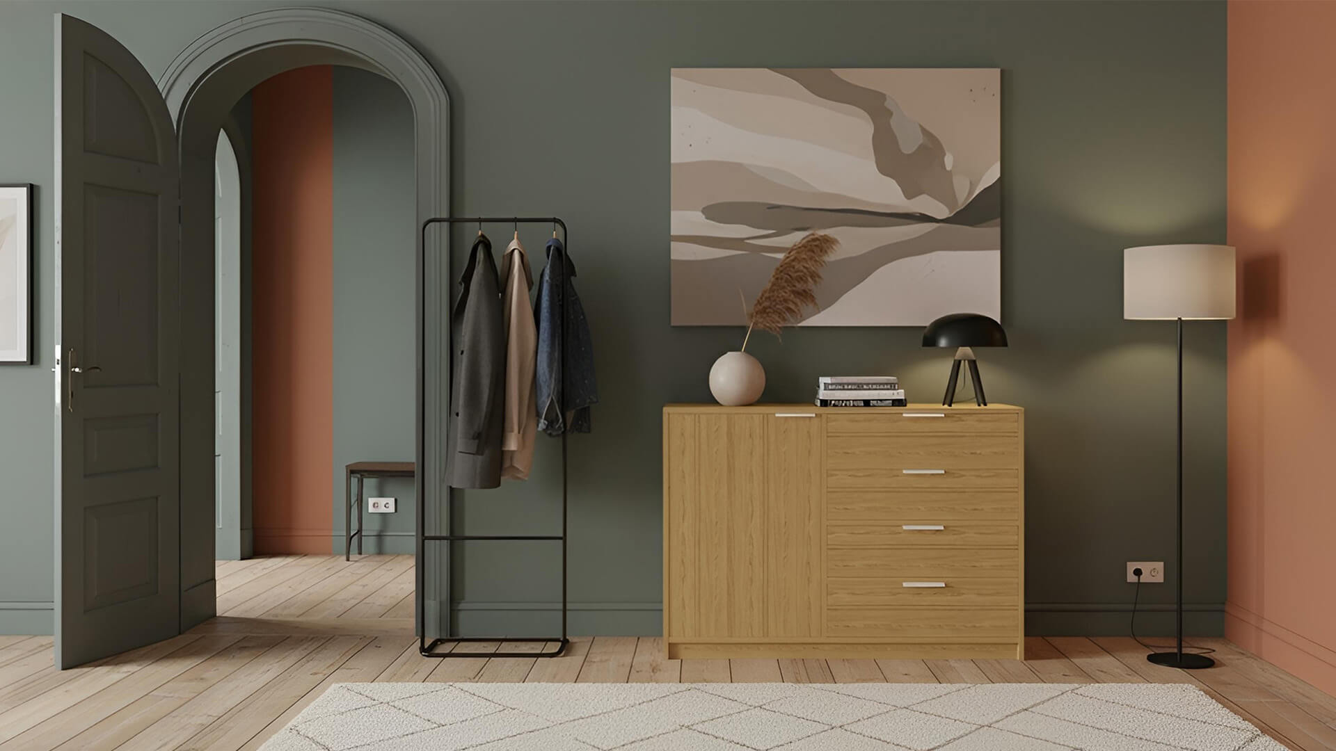 Moderne graue Holzkommode mit viel Stauraum und stilvollem Design