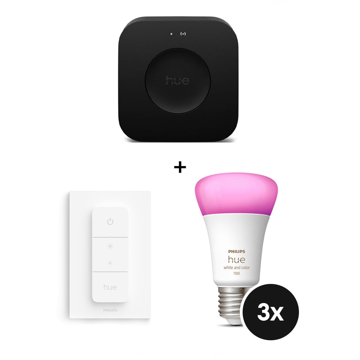 DA+–GPhilips Hue White & Color Ambiance Starter-Set, Lampe, 11W, A60, E27, 1100lm, Dimmschalter, Dreierpack (929002468804)
