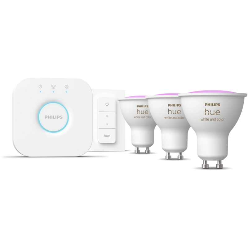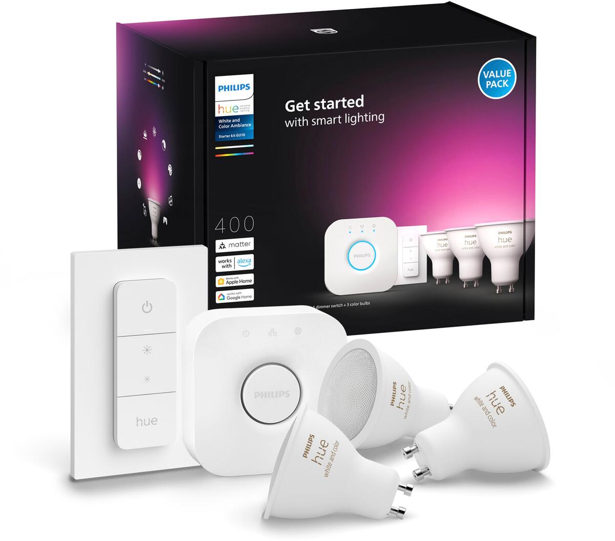 Philips Hue White & Color Ambiance Starter Set mit 3 x GU10 RGBW Lampen 4,2W wie 35W & Bridge, EEK: E (Spektrum: A bis G)