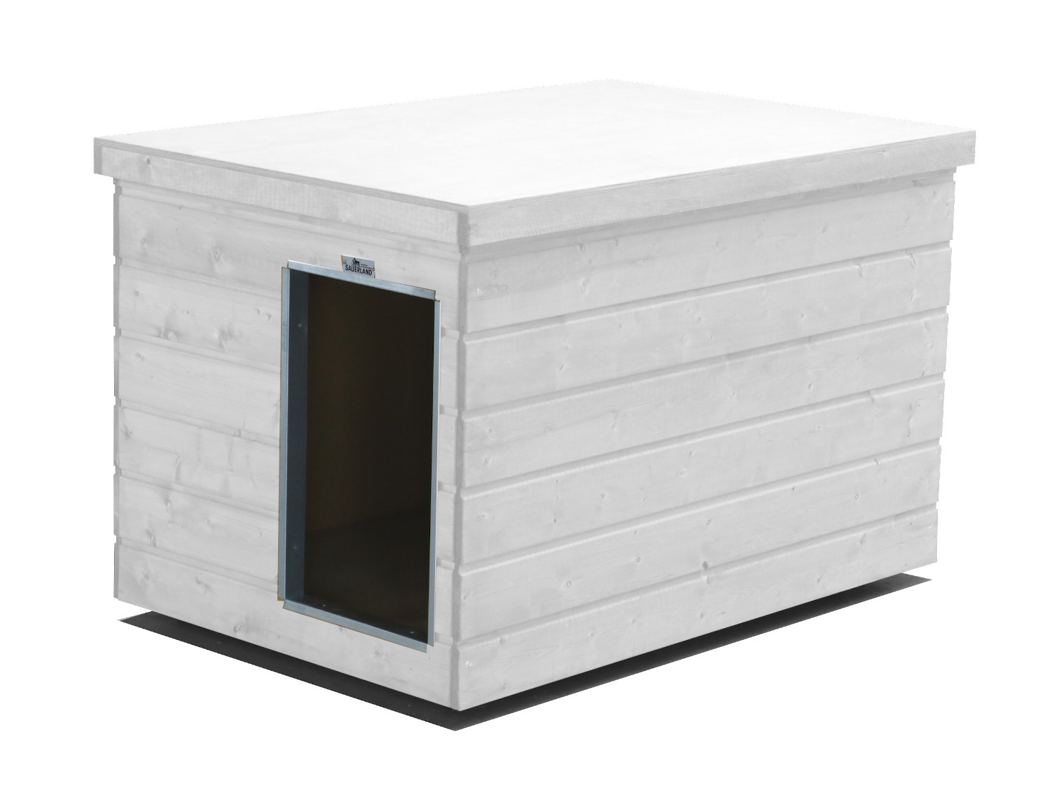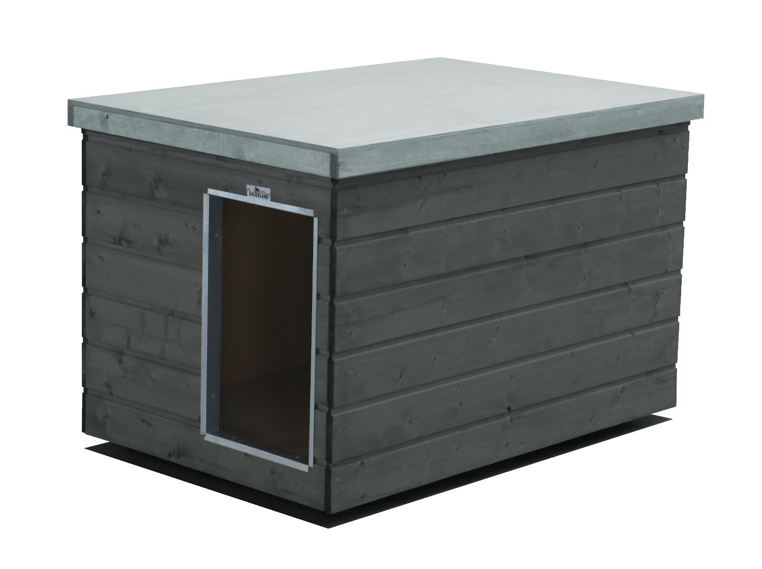 Original SAUERLAND Holz-Hundehütte mit Vorraum, Korpus graphit/Dach platin imprägniert | Flachdach Dickschicht | Eingang Längsseite | Größe Dino