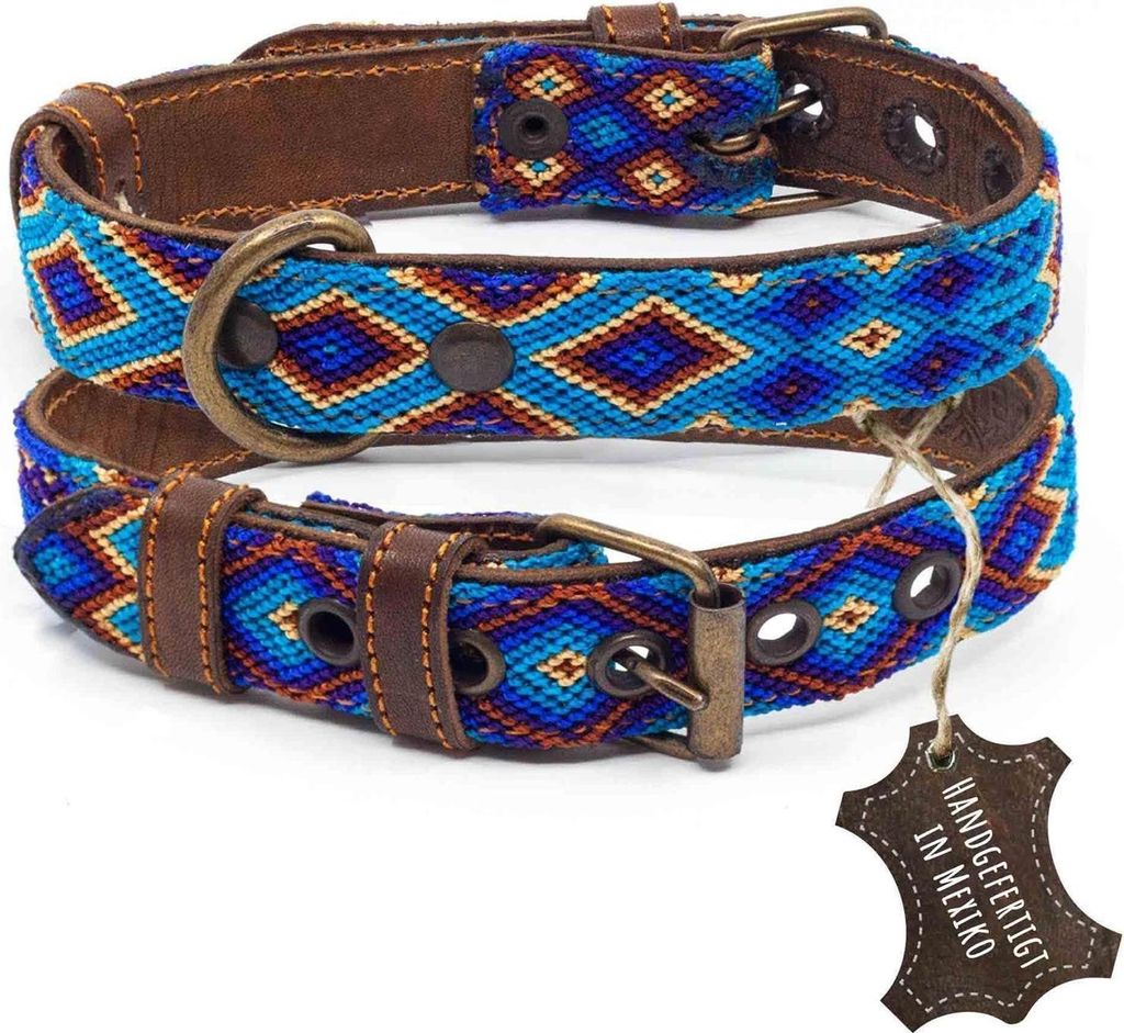 ALTEZAR Blaues Hundehalsband aus Leder Tribal Blau Handgemacht in Mexiko - Größe S