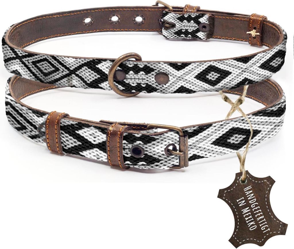 ALTEZAR Hundehalsband Leder Doppel-Tribal Schwarz-Weiß Handgemacht in Mexiko - S