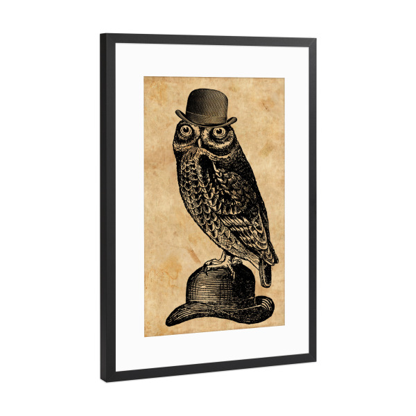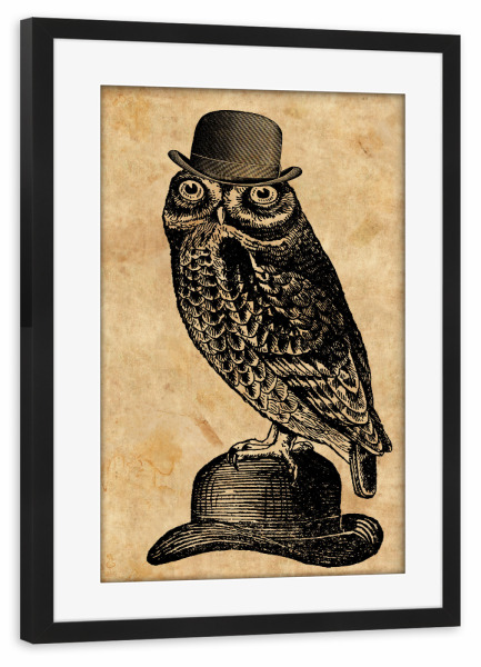 Poster mit schwarzem Rahmen "Eule in einem Hut" artboxONE - Tiere,Fashion - Eule in einem hut,Eule,Hut,Melone,Tier,Wald,Wirbeltier,Lustig