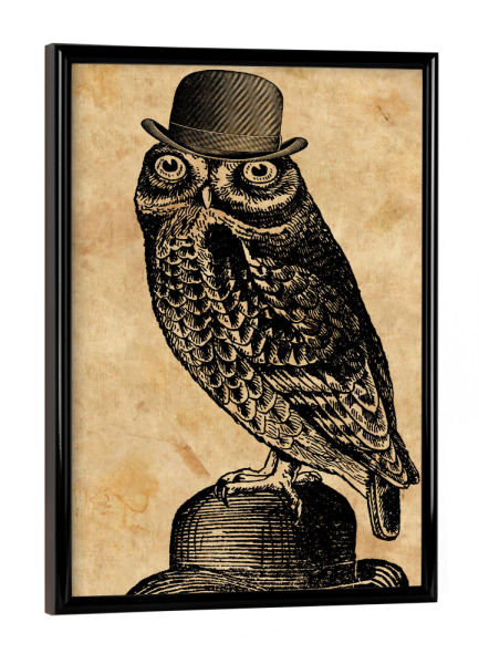 Poster mit Rahmen Schwarz (Metallic) "Eule in einem Hut" artboxONE - Tiere,Fashion - Eule in einem hut,Eule,Hut,Melone,Tier,Wald,Wirbeltier,Lustig
