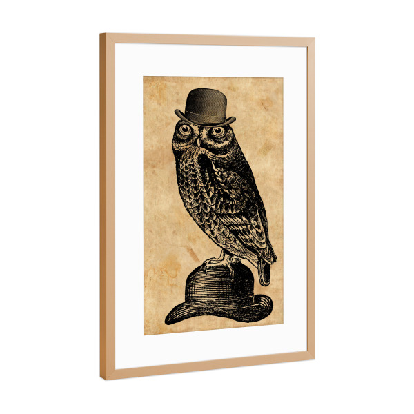 Poster mit Rahmen Kupfer "Eule in einem Hut" artboxONE - Tiere,Fashion - Eule in einem hut,Eule,Hut,Melone,Tier,Wald,Wirbeltier,Lustig