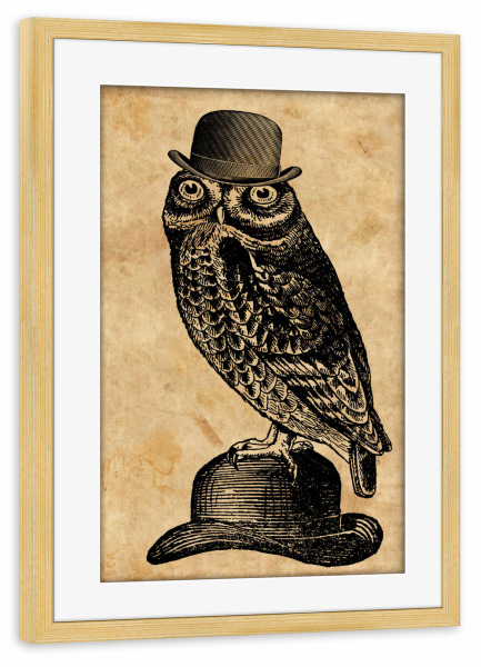 Poster mit Rahmen kiefer "Eule in einem Hut" artboxONE - Tiere,Fashion - Eule in einem hut,Eule,Hut,Melone,Tier,Wald,Wirbeltier,Lustig