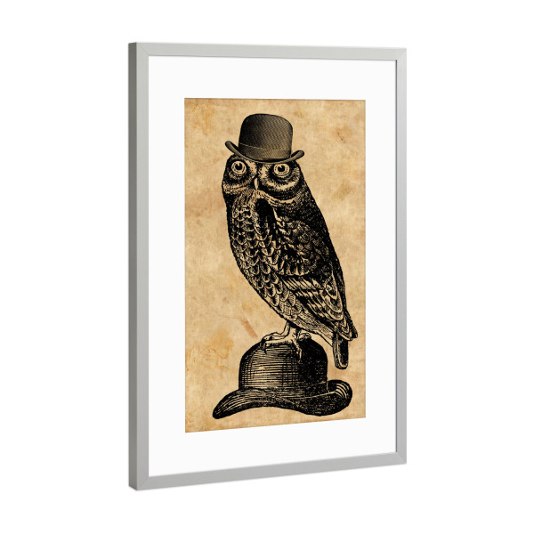 Poster mit Rahmen Silber "Eule in einem Hut" artboxONE - Tiere,Fashion - Eule in einem hut,Eule,Hut,Melone,Tier,Wald,Wirbeltier,Lustig