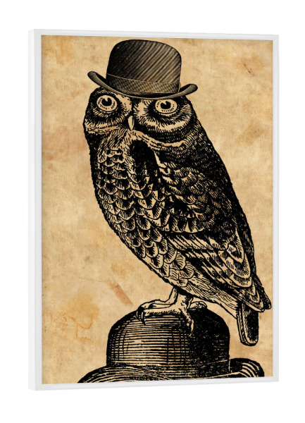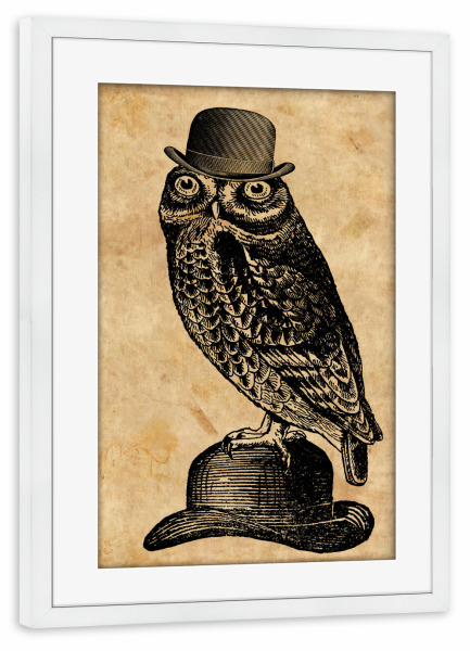 Poster mit Rahmen weiß "Eule in einem Hut" artboxONE - Tiere,Fashion - Eule in einem hut,Eule,Hut,Melone,Tier,Wald,Wirbeltier,Lustig