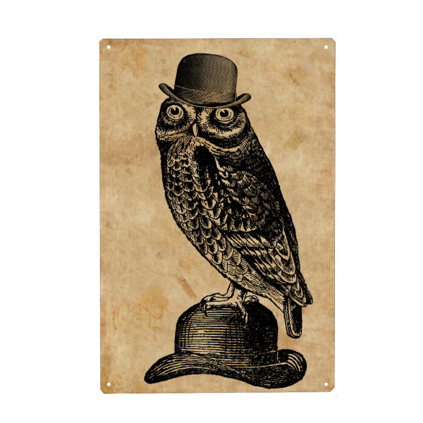 Metall Poster "Eule in einem Hut" artboxONE - Tiere,Fashion - Eule in einem hut,Eule,Hut,Melone,Tier,Wald,Wirbeltier,Lustig - Blechschild