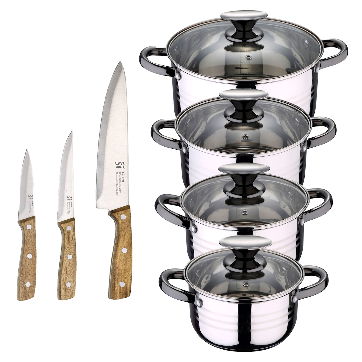 BERGNER - DINA 8-teiliges Kochgeschirr-Set (16/18/20/24cm) aus Edelstahl, geeignet für Induktionskochfelder, mit einem Set aus 3 Edelstahlmessern