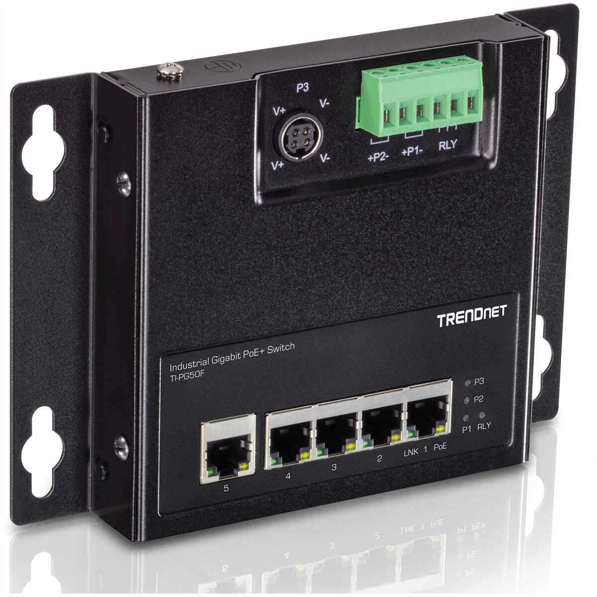 TRENDnet TI-PG50F 5-Port Industrial PoE+ Gigabit Front Access Switch, wandmontierbar