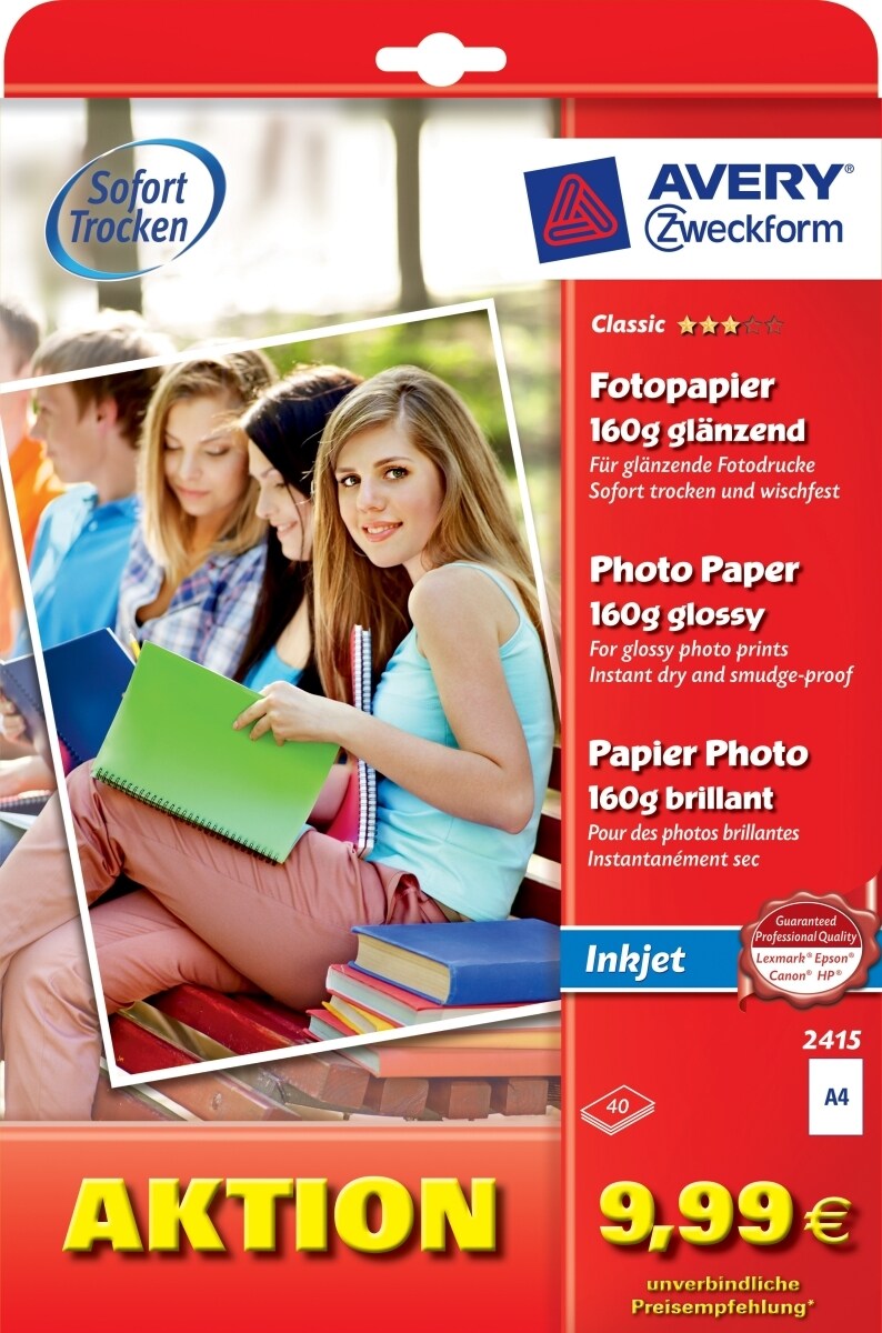 Avery Zweckform Fotopapier Classic Inkjet A4 40 Blatt 160 g/qm glänzend Packung mit 18 Stück
