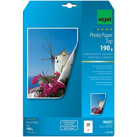 SIGEL IP720 Inkjet Fotopapier Top, 2-seitig hochglänzend, 190 g/m², A4, 20 Blatt