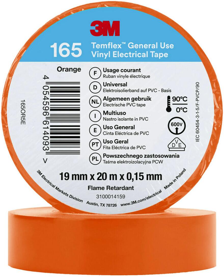 3M Temflex 165, 19 mm x 20 m, 0,15 mm, Orange, Professionelles Vinyl-Isolierband, Für allgemeine Primärisolations Aufgaben bis 600 Volt