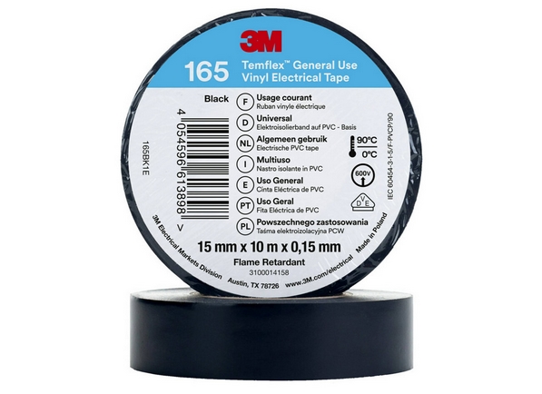 3M Temflex 165, 25 mm x 25 m, 0,15 mm, Schwarz, Professionelles Vinyl-Isolierband, Für allgemeine Primärisolations Aufgaben bis 600 Volt