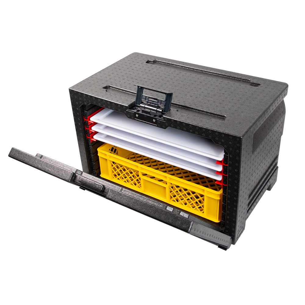 Thermo Future Box, Frontlader mit Quereinschub 60 x 40 (20), Isolierbox mit Fronttür, schwarz, 96 Liter, 9 variable Einschübe, nachhaltig aus EPP