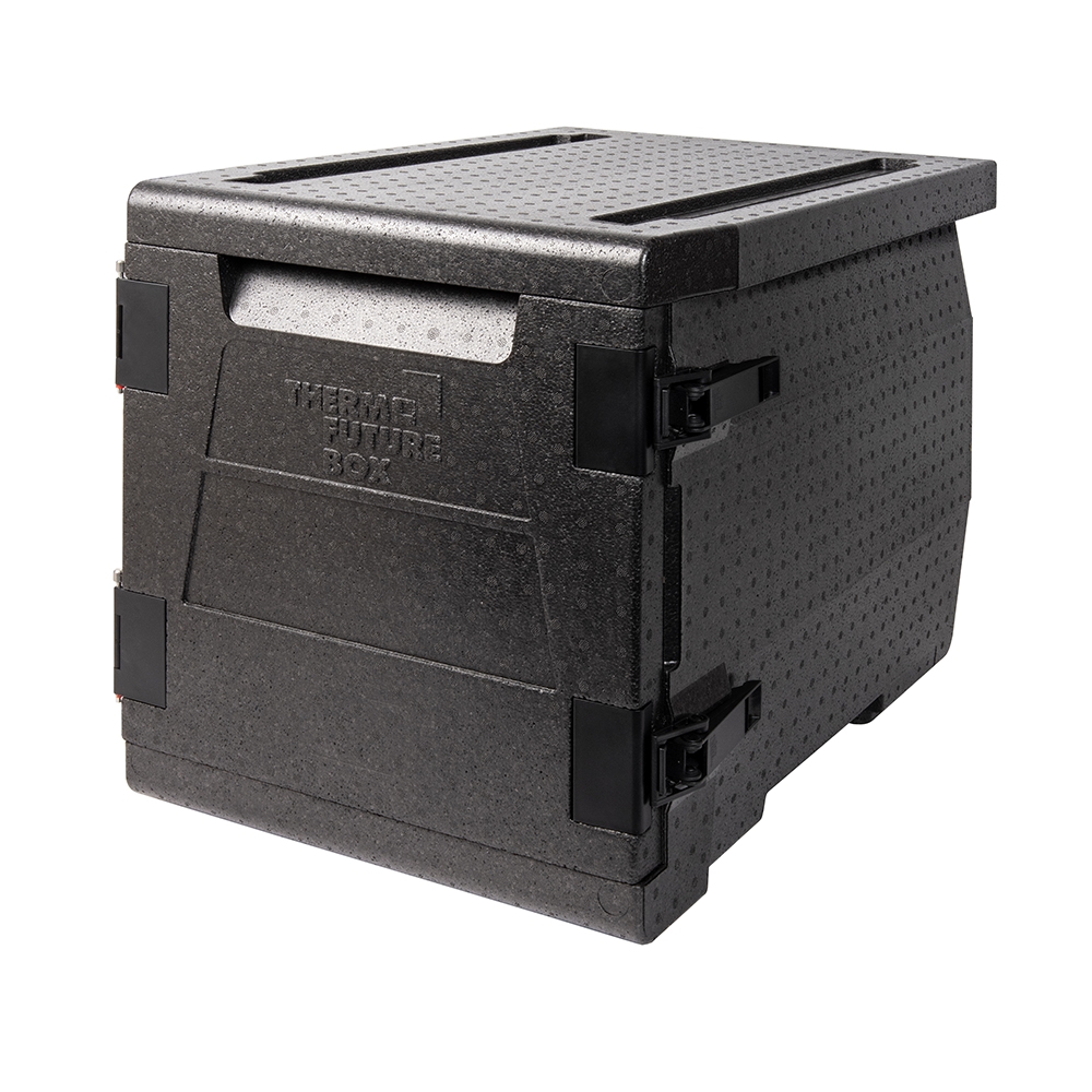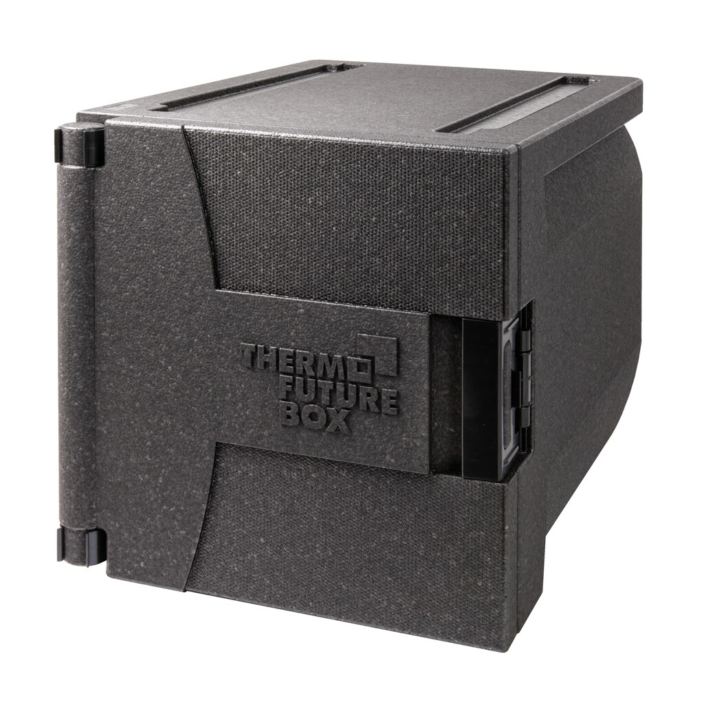Thermo Future Box, Frontlader GN 1/1, Isolierbox mit Fronttür, schwarz, 65 Liter, 8 Einschübe, nachhaltig aus EPP