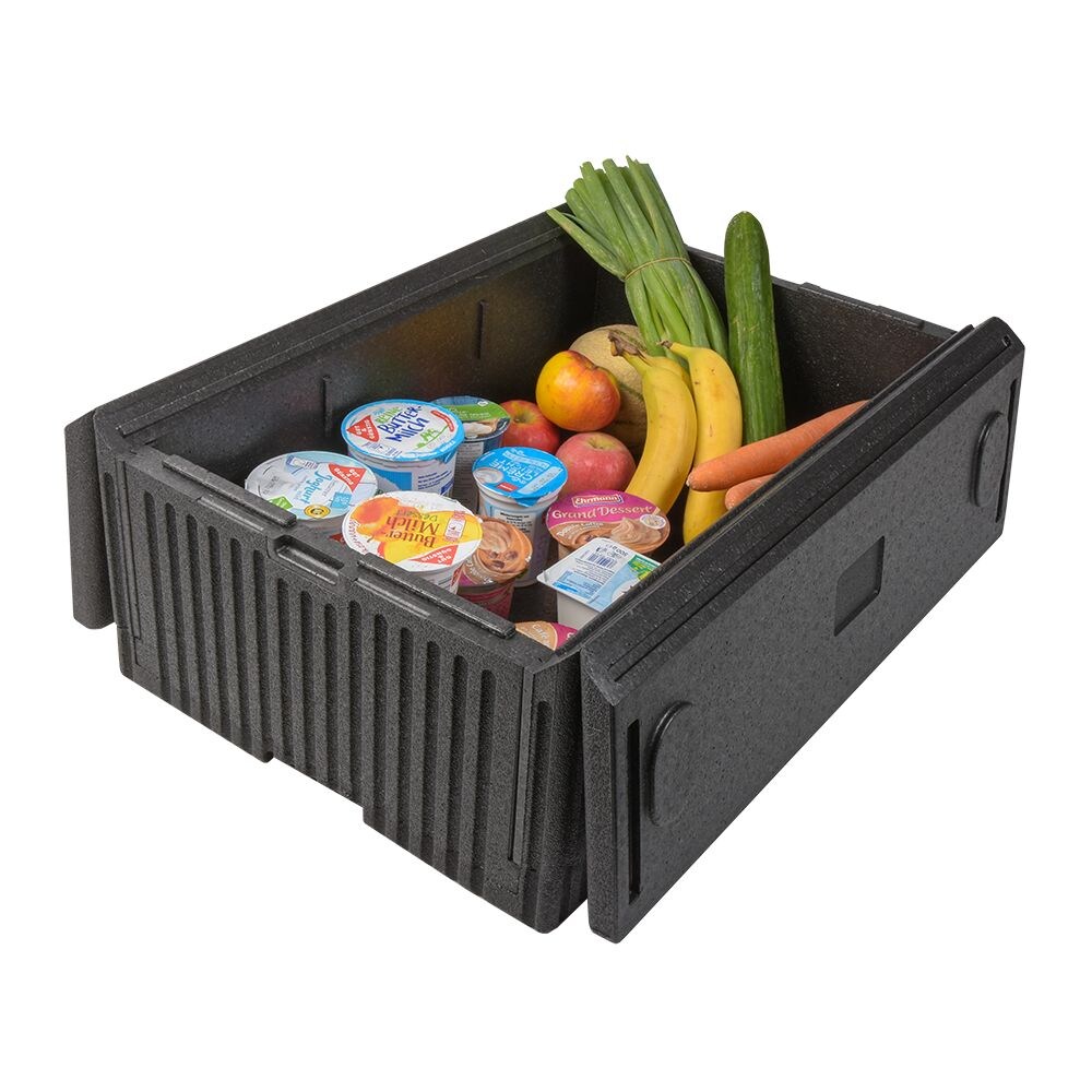 Thermo Future Box, Frontlader ECO GN 1/1, Isolierbox mit Fronttür, schwarz, 69 Liter, 9 Einschübe, nachhaltig aus EPP