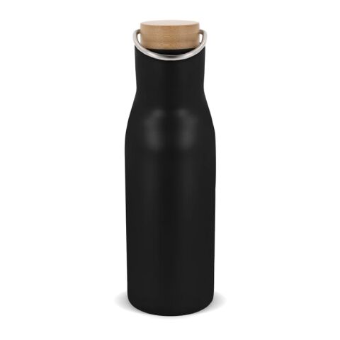 Werbeartikel 500 ml Isolierflasche aus Edelstahl vakuumisoliert mit echtem Bambusdeckel & Matt-Finish – schwarz – mit Logo bedruckt