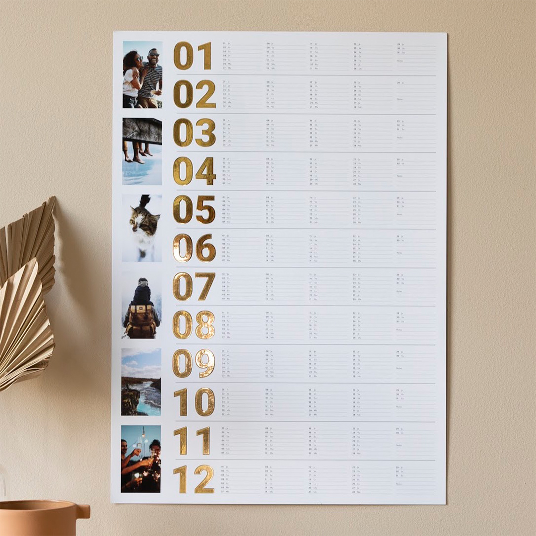Jahresplaner 2025 selbst gestalten mit Foto 42 x 60 cm in weiss mit Goldfolie Jahreskalender Design: Bold Year. kartenmacherei