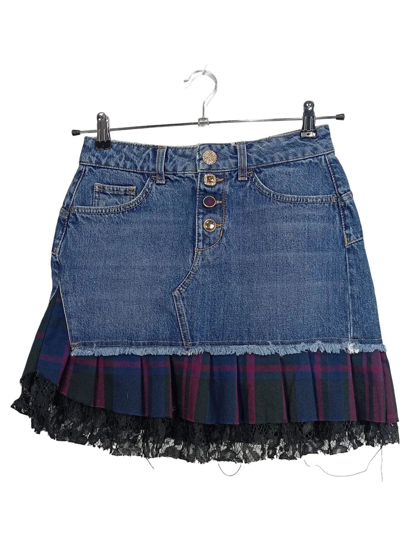 MARKENLOS LIU JO Jeansrock Damen Gr. 27/36 Blau Kariert Spitze Minirock