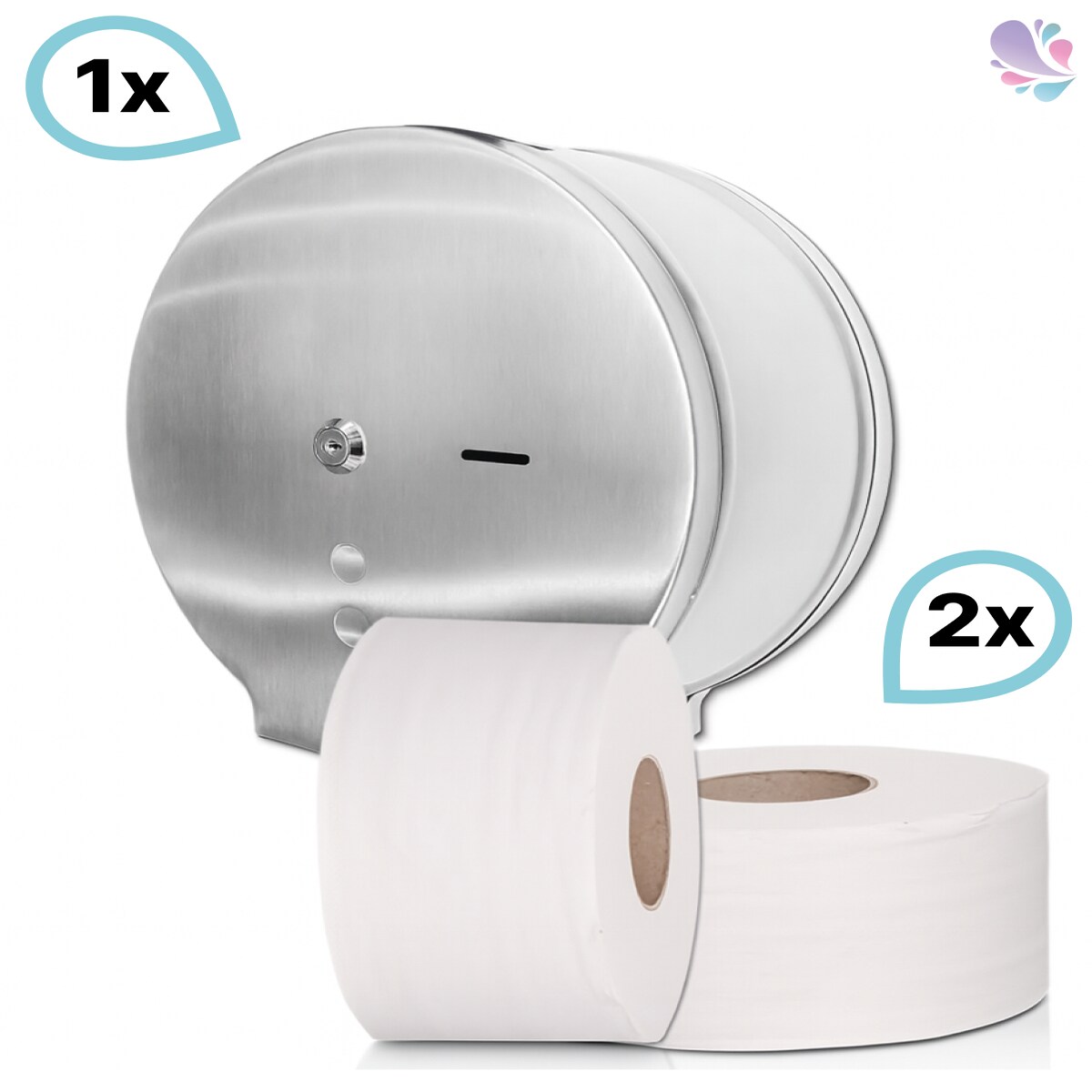 Blanc HYGIENIC SET: 1x Jumbo-Toilettenpapierspender EDELSTAHL matt + 2 Jumborollen-Toilettenpapier 300m, 2-lagig