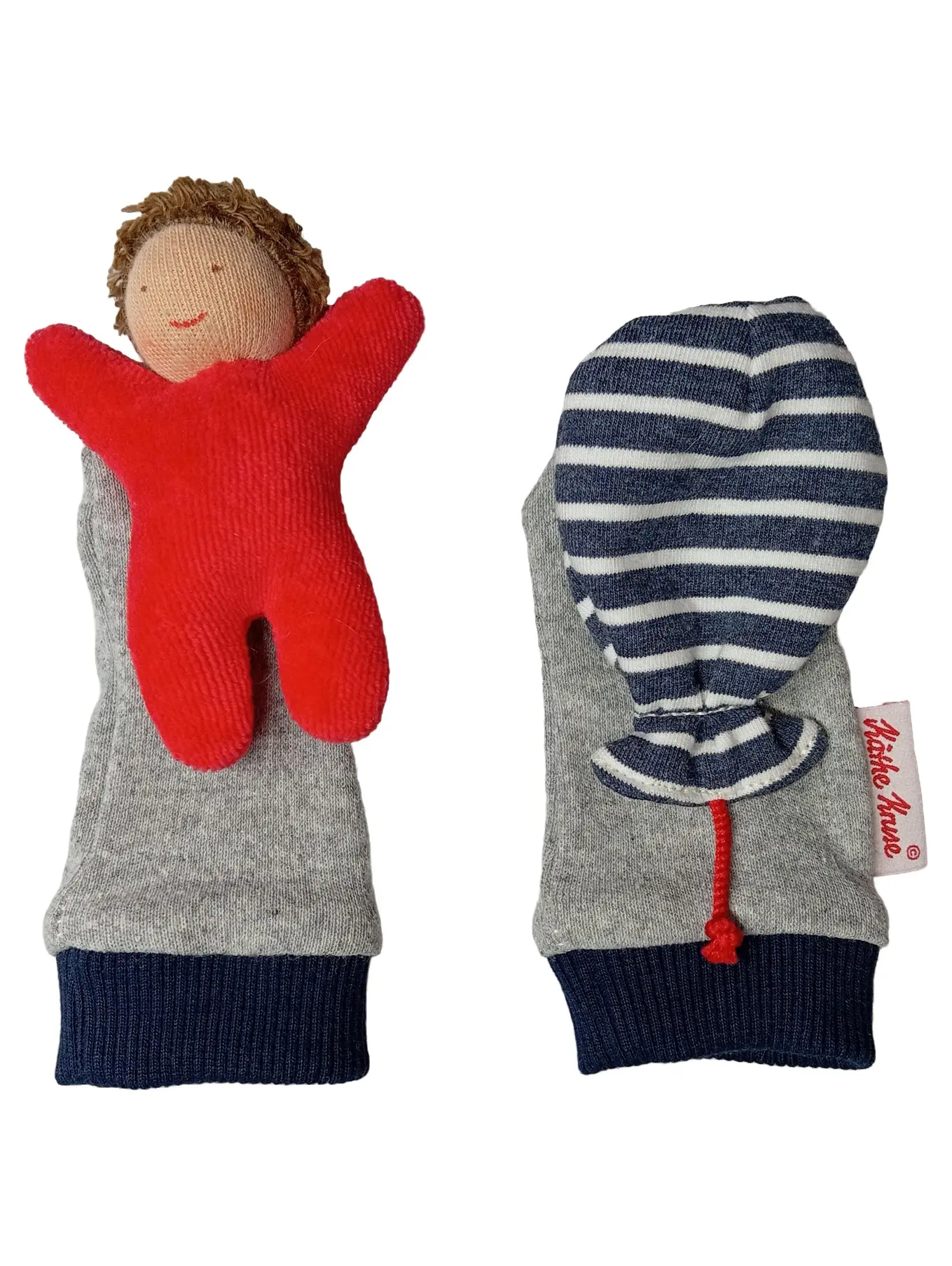 KÄTHE KRUSE Baby Fäustlinge mit Puppe Grau Gestreift Baumwolle