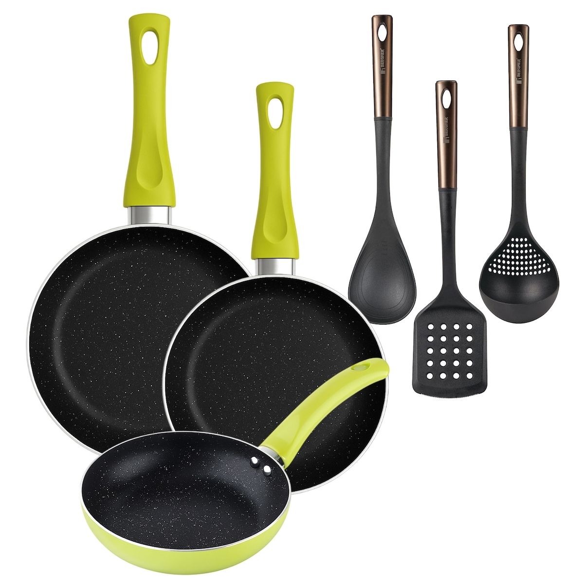 BERGNER - Set aus 3 Pfannen Ø20/Ø24/Ø28 cm gepresstes Aluminium Molen Grün Set 3 Küchenutensilien aus schwarzem PBT und Kupfer