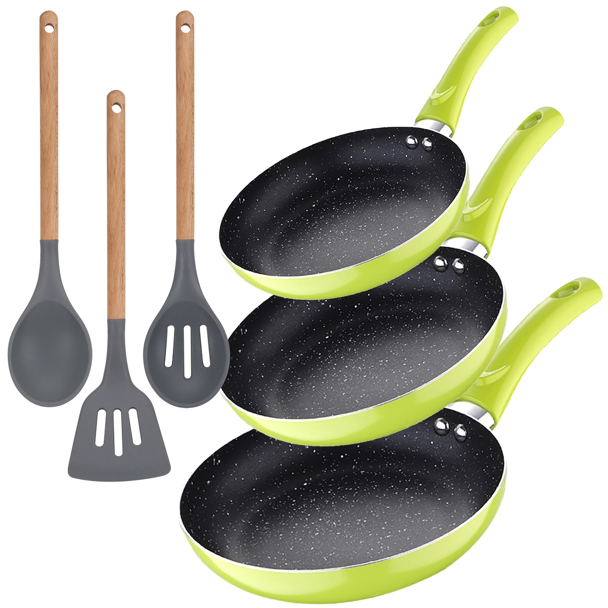 San Ignacio - 3-teiliges Set Pfannen (20/24/28 cm) aus gepresstem Aluminium in Grün mit 3-teiligen Küchenutensilien aus Silikon-Holz