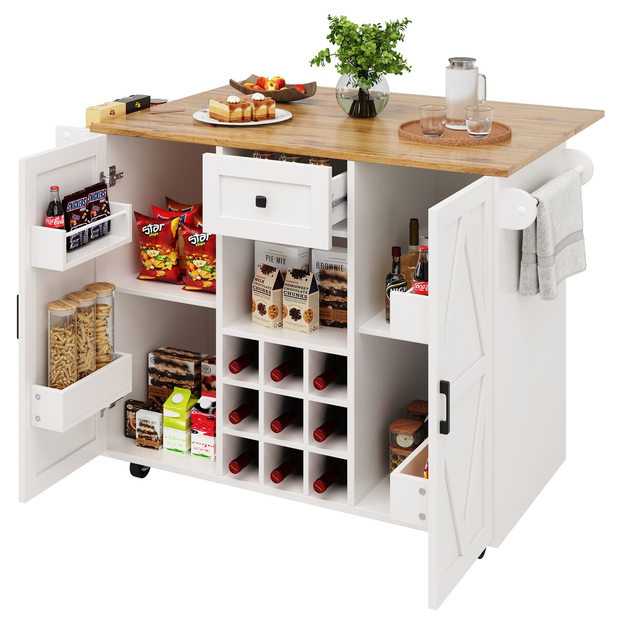Kücheninsel Küchenwagen auf Rollen mit Klappbar Arbeitsplatte, Schublade, Küchenschrank Rollbar mit Einlegeboden, Handtuchstange, Gewürzregal, ...