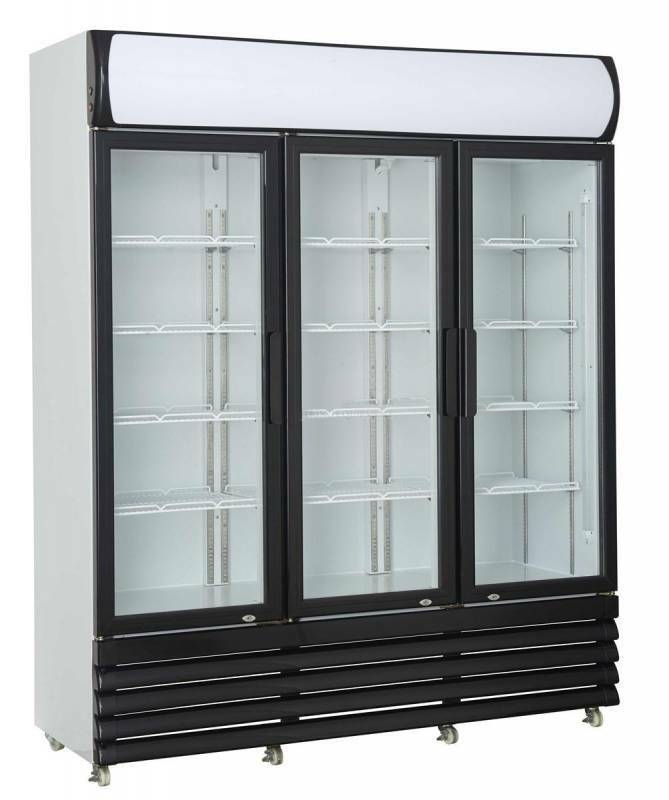 Gastro Kühlschrank mit Werbetafel und 3 Glastüren 1530 Liter Umluftkühlung