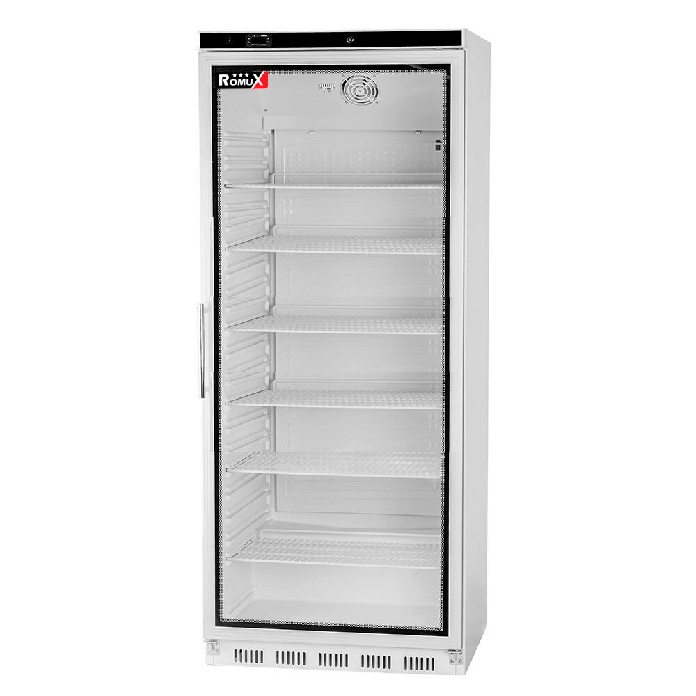 Romux Kühlschrank ABS 600 Liter mit 1 Tür Glastür 77 cm mit Umluftkühlung weiß | Gastro Kühlschrank mit 600 L Kapazität - 4 Einlegeböden und 280 W