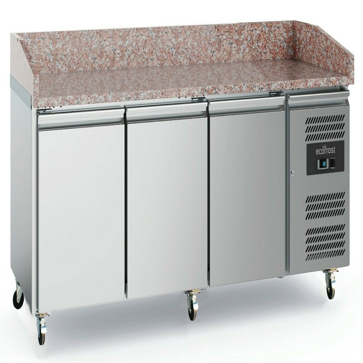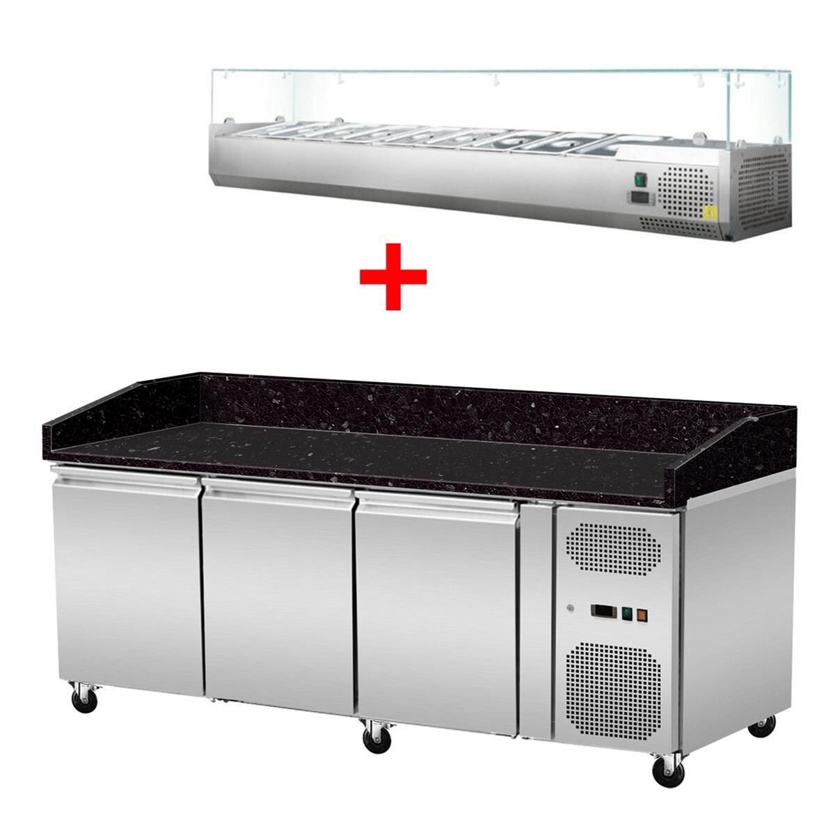 Pizza-Kühltisch 160x88x130cm mit 2 Türen & 3 ungekühlte Schubladen inkl. Kühlaufsatzvitrine, schwarzer Granit | Pizzakühltisch, GastroHero